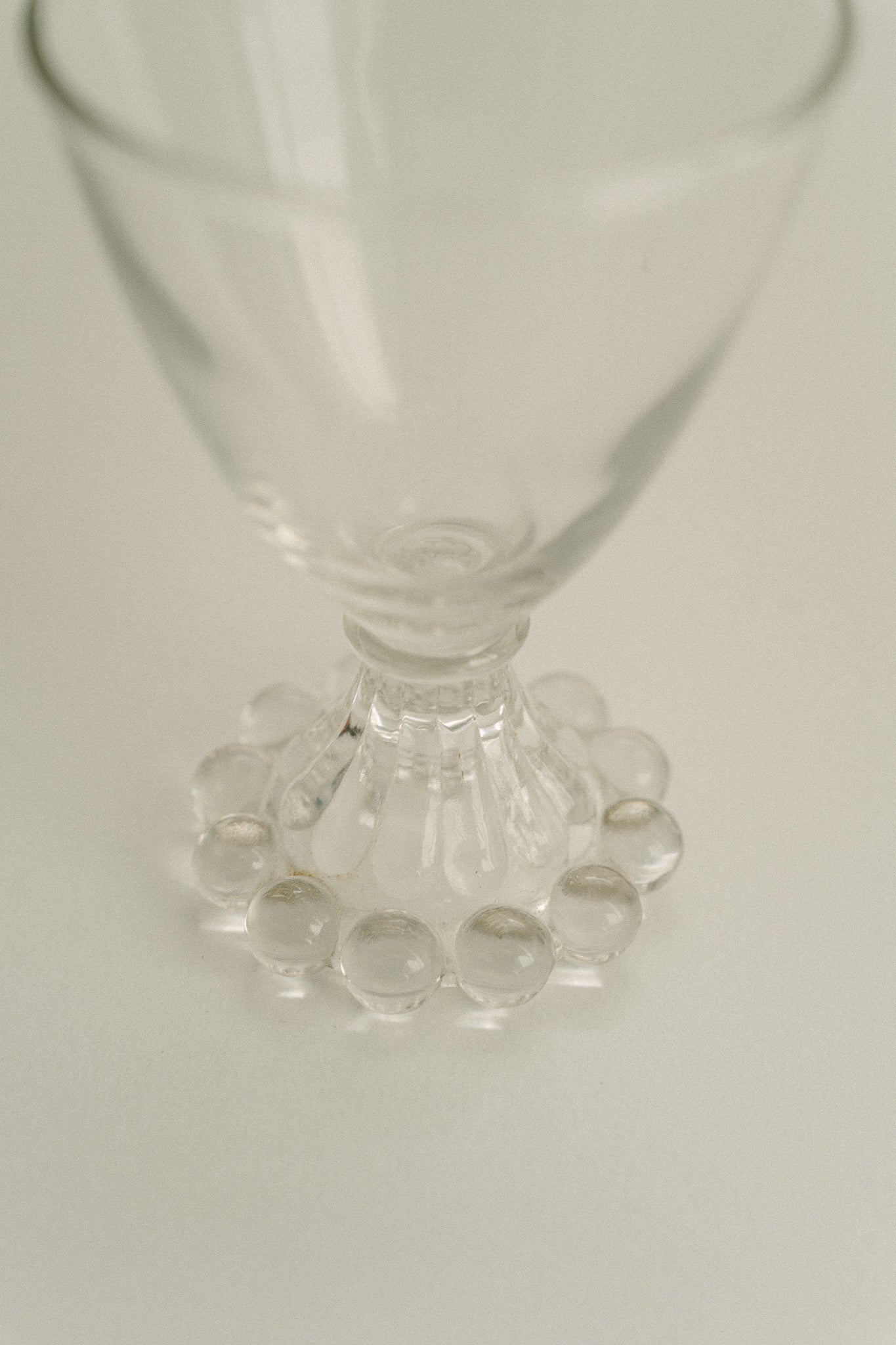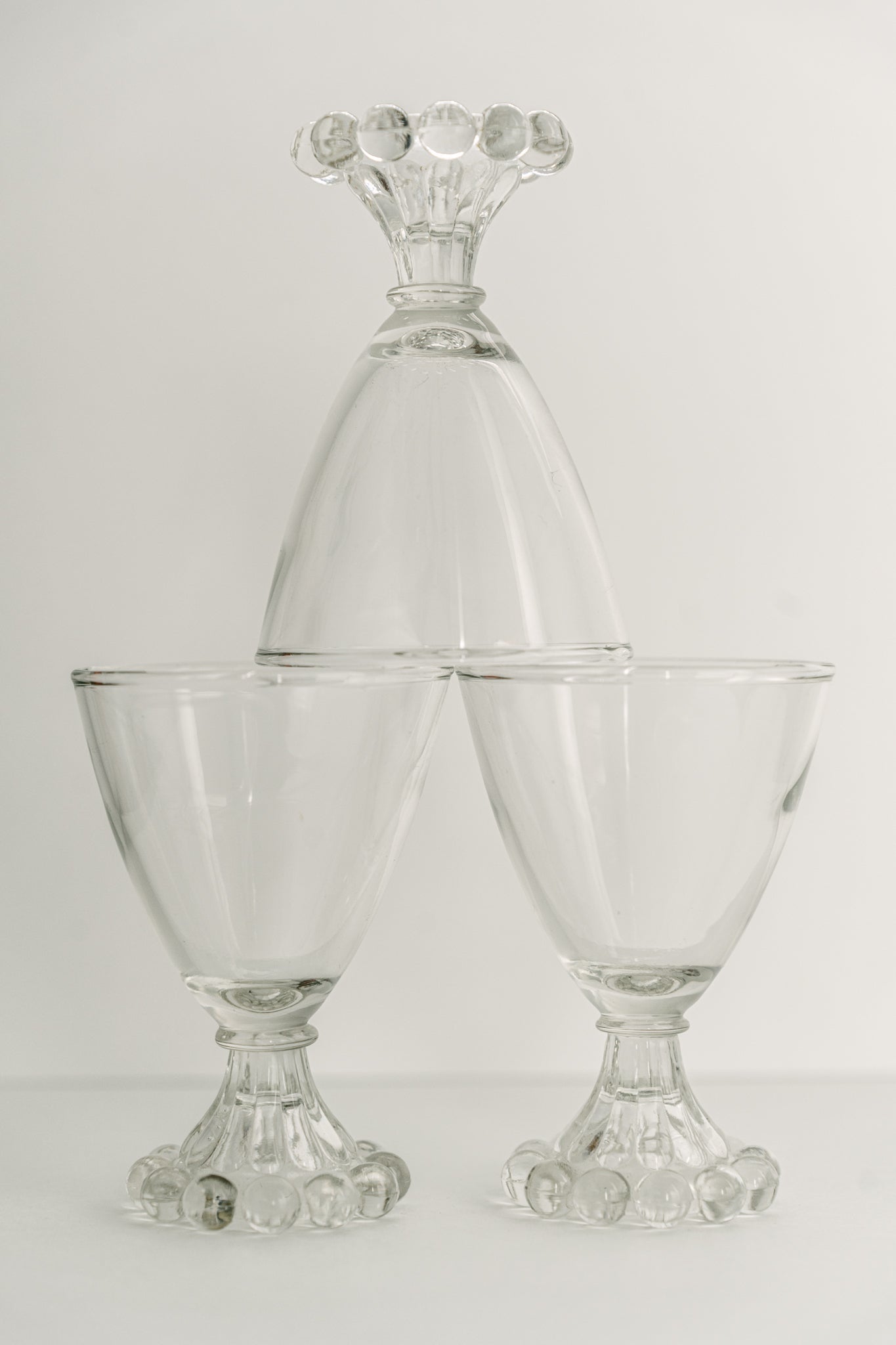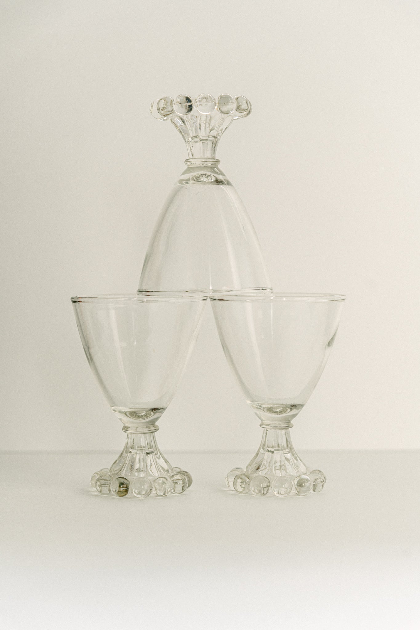 A pair of vintage clear glasses, each featuring a delicate beaded base – a popular design from the 1940s through to the 1960s.